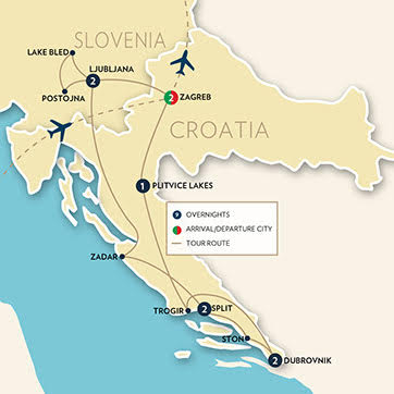 Featuring six UNESCO World Heritage Treasures (Dubrovnik Old Town, Historical Split with Diocletian’s Palace, Defensive walls of Zadar, Plitvice Lakes National Park, Historic Town of Trogir & Plecnik’s Ljublijana with Triple Bridge). Other highlights include Postojna Cave with Train, Bled Castle & Lake Bled